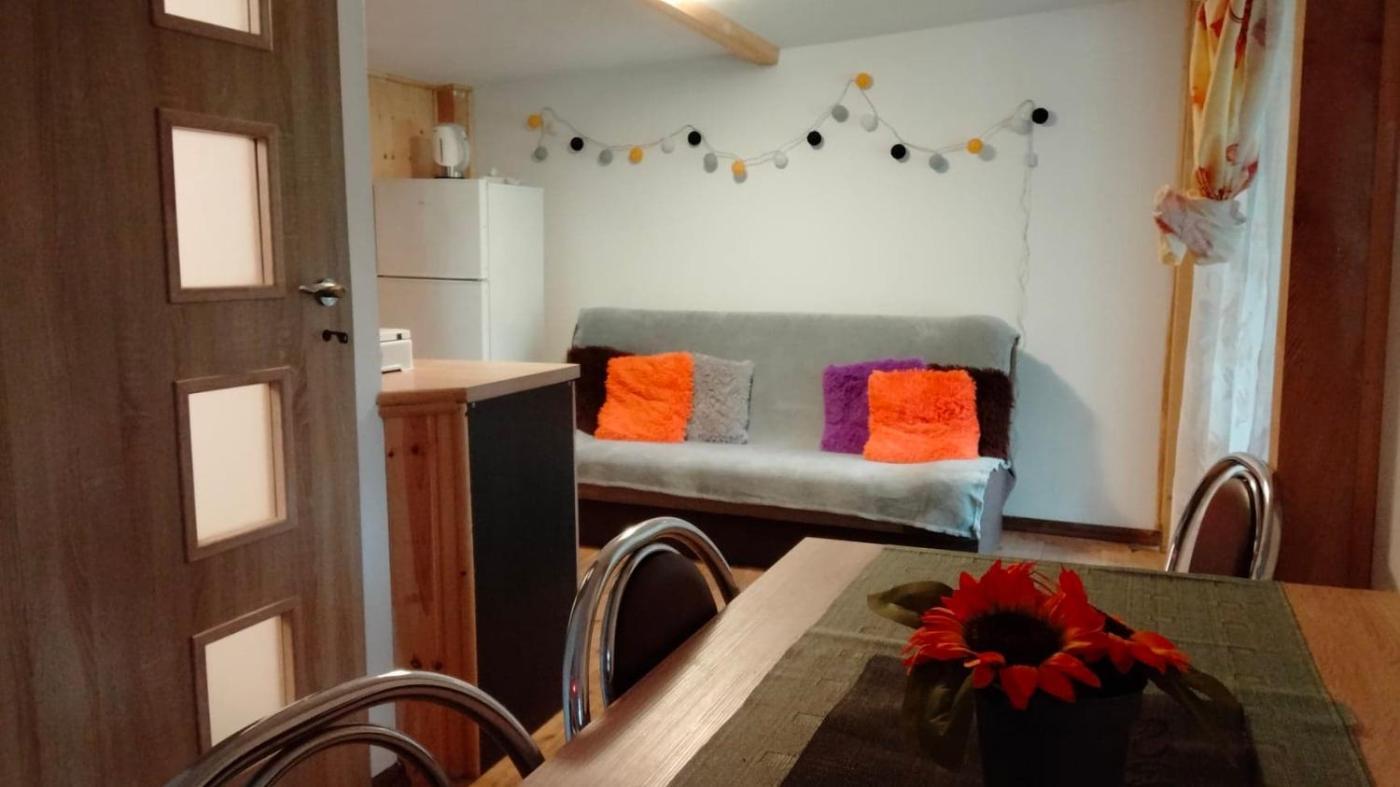 Domek. This chalet comes with 1 living room, 1 separate bedroom and 1 bathroom with a shower. The chalets kitchenette, which has a refrigerator and kitchenware, is available for cooking and storing food. Boasting a terrace, this chalet also features an electric kettle and a flat-screen TV. The unit has 3 beds. Domek - 6 osobowy. Powierzchnia pokoju ok.: 20 mkw.